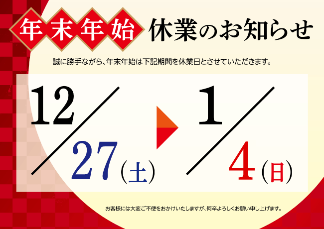 誠に勝手ながら年末年始の休業を下記の通りとさせていただきますので、